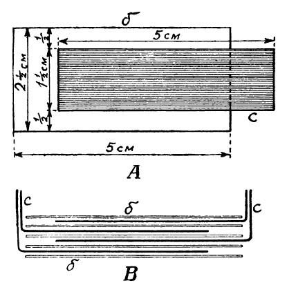 Положив на стол кусочек бумаги, накладывают на нее полоску станиоля так, чтобы (А, рис. 2) с трех сторон станиоль на 0,5 см отступал от краев бумаги, а с четвертой свешивался с нее на 1 см. Сверху накрывают вторым листком бумаги, края которого должны совпасть с краями первого листка, а на него вторую станиолевую полоску, но так, чтобы свободный край ее свешивался в сторону противоположную, чем у первой его полоски (схему расположения b – бумажных и с – станиолевых отрезков см. В, рис. 2).