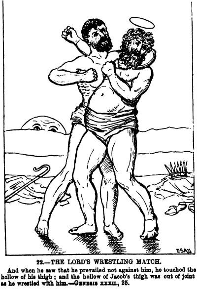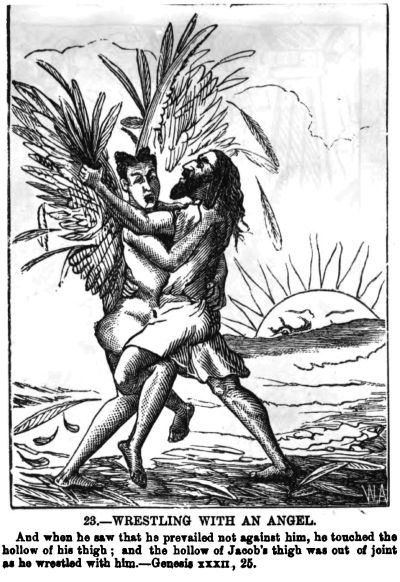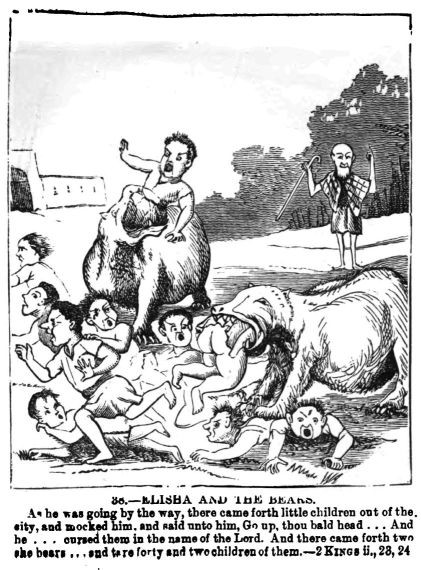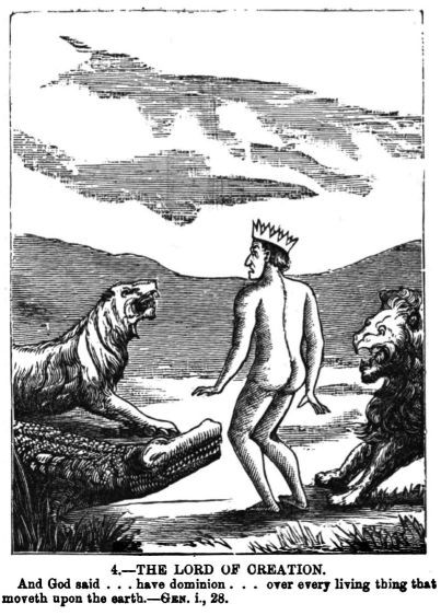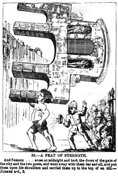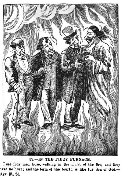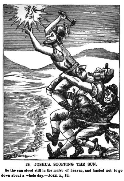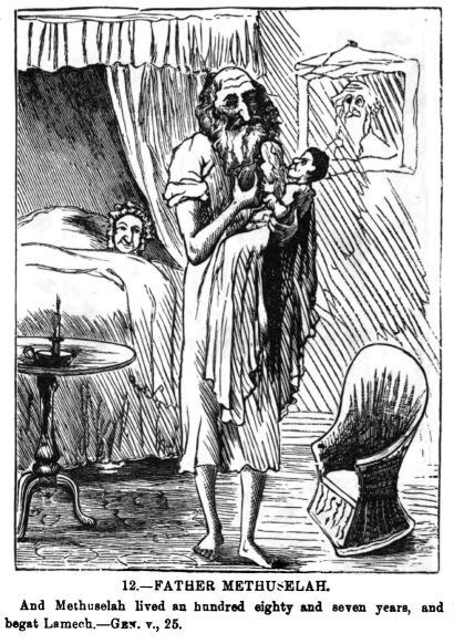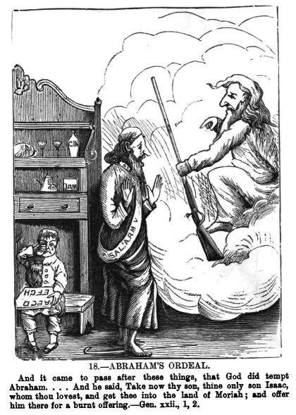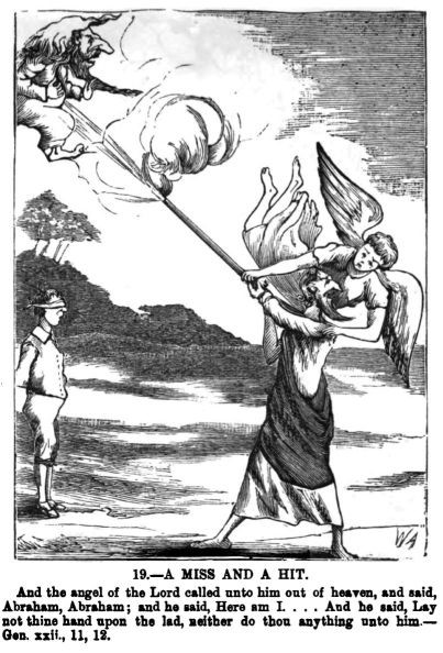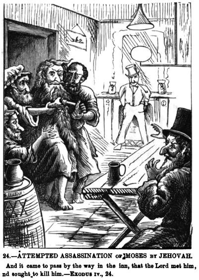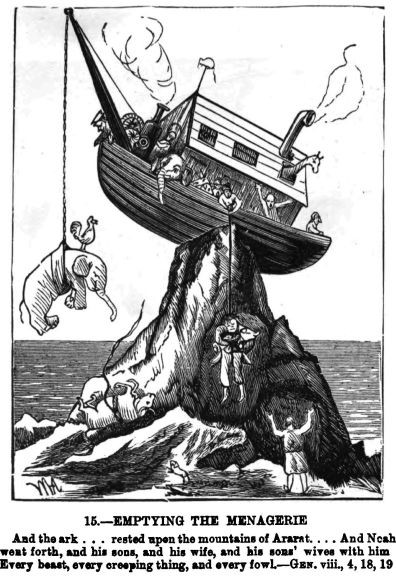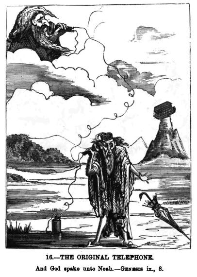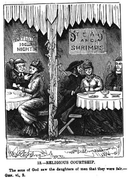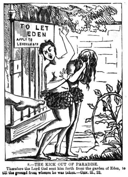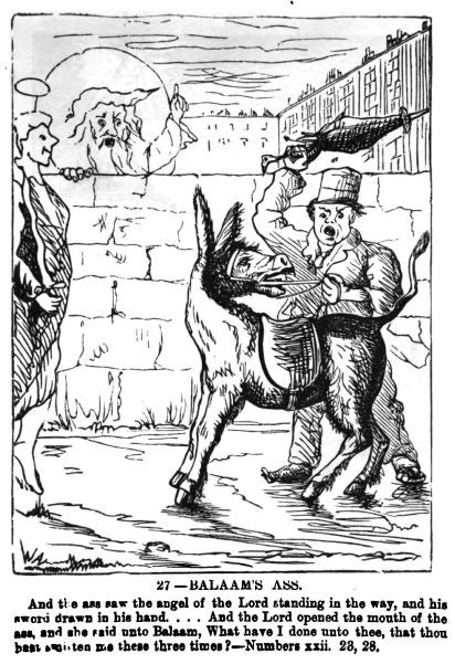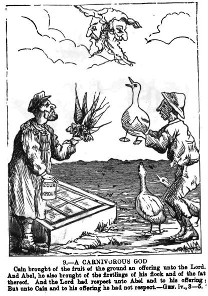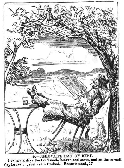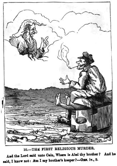 The same spirit has animated us in designing the pictures. Our object has been to take the Bible text always as our basis, to include no feature which is contradicted by it, and to introduce as many comicalities and anachronisms as possible consistently with this rule. We are therefore able to defy criticism. Bibliolators may vituperate us, persecute us, or imprison us, but they cannot refute us.. We can safely challenge them to prove that a single incident happened otherwise than we have depicted it. We can candidly say to them—"The thing must have happened in some way, as to which the Divine Word is silent; this is our view,—What is yours?" And we humbly submit that our speculations are as valid as our neighbors'. Nothing but the insanest bigotry in favor of their own conjectures could lead them to quarrel with us for expounding ours. If they can shame us with explicit disproofs from Holy Writ, let them do so; but what right have they to set up their carnal imaginings and uninspired theories as the ultimate criteria of truth?