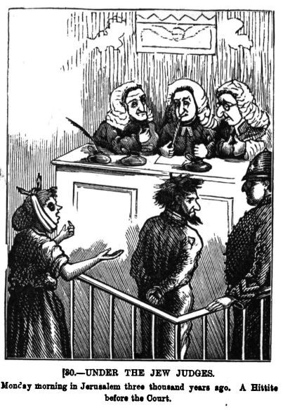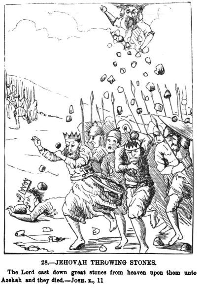 A word in conclusion. The editor of the "Manchester Examiner," writing over the well-Known signature of "Verax," recently published a long article, censuring the policy of aggressive Freethought, and declaring that to laugh at the absurdities of the Bible was to insult the human race. We might as well, he said, laugh at our poor ancestors, the ancient Britons, for all their mistakes and follies. Well, when the ancient Jews are not only dead, but buried like the ancient Britons; when their mistakes and follies are no longer palmed off on unsuspecting children, and imposed on grown-up men and women, as divine immortal truths; we will cease ridiculing them, and devote our attention to worthier objects. What, would "Verax" say if an ancient Briton, dressed in a full suit of war-paint, were to walk through the Manchester streets, boasting himself the pink of fashion, and insulting peaceable citizens who refused to patronise his tailor? Would he not write a racy article on the absurd phenomenon, and ask why the police tolerated such a nuisance? In like manner we publish our Comic Bible Sketches, and summon the police of thought to remove those ancient Jews who still infest our mental thoroughfares.