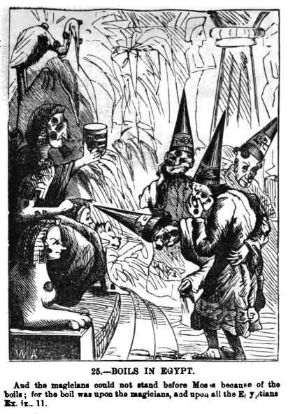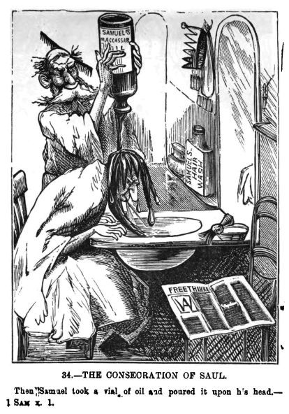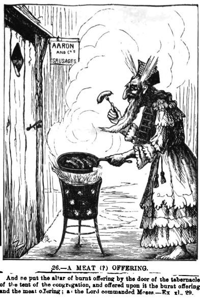Let it be observed that these Comic Bible Sketches ridicule nothing but miracles. Mr. Mathew Arnold has said that the Bible miracles are only fairy tales (very poor ones, by the way) and their reign is doomed. We only seek to hasten their deposition. Whatever the Bible contains of truth, goodness and beauty, we prize as well as its blindest devotees. But this valuable deposit of antiquity would be more useful if cleared of the rubbish of superstition. It is not the good, but the evil parts of the Bible, that are supported by its supernaturalism. Why should civilised Englishmen go walking about in Hebrew Old-Clothes? Let us heed Carlyle's stern monition:—"The Jew old-clothes having now grown fairly pestilential, a poisonous incumbrance in the path of of men, burn them up with revolutionary fire."