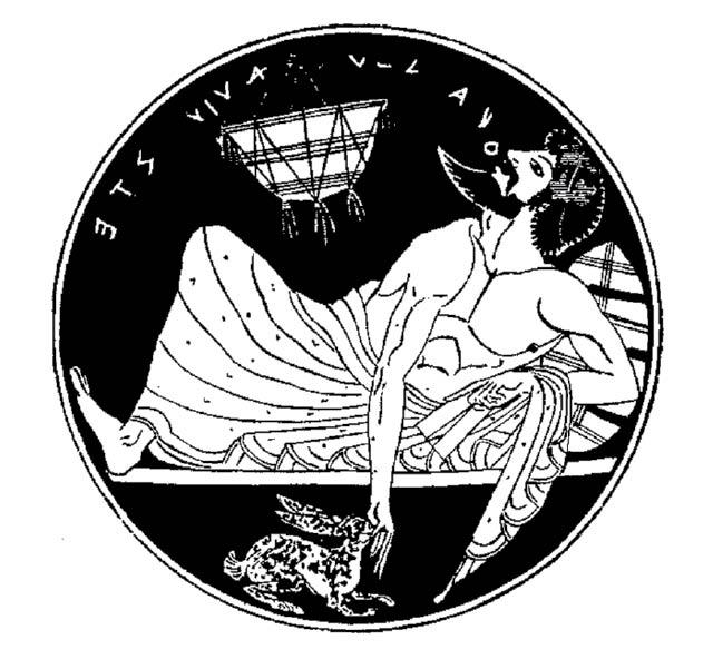 Роспись внутренней поверхности килика из Танагры, Беотия, V в. до н. э. (с 525 по 475 г. до н. э.). Сцена изображает лежащего симпосиаста с кроталой, играющего с кроликом и поющего «O pedon kalliste» (начало стиха Феогнида).
