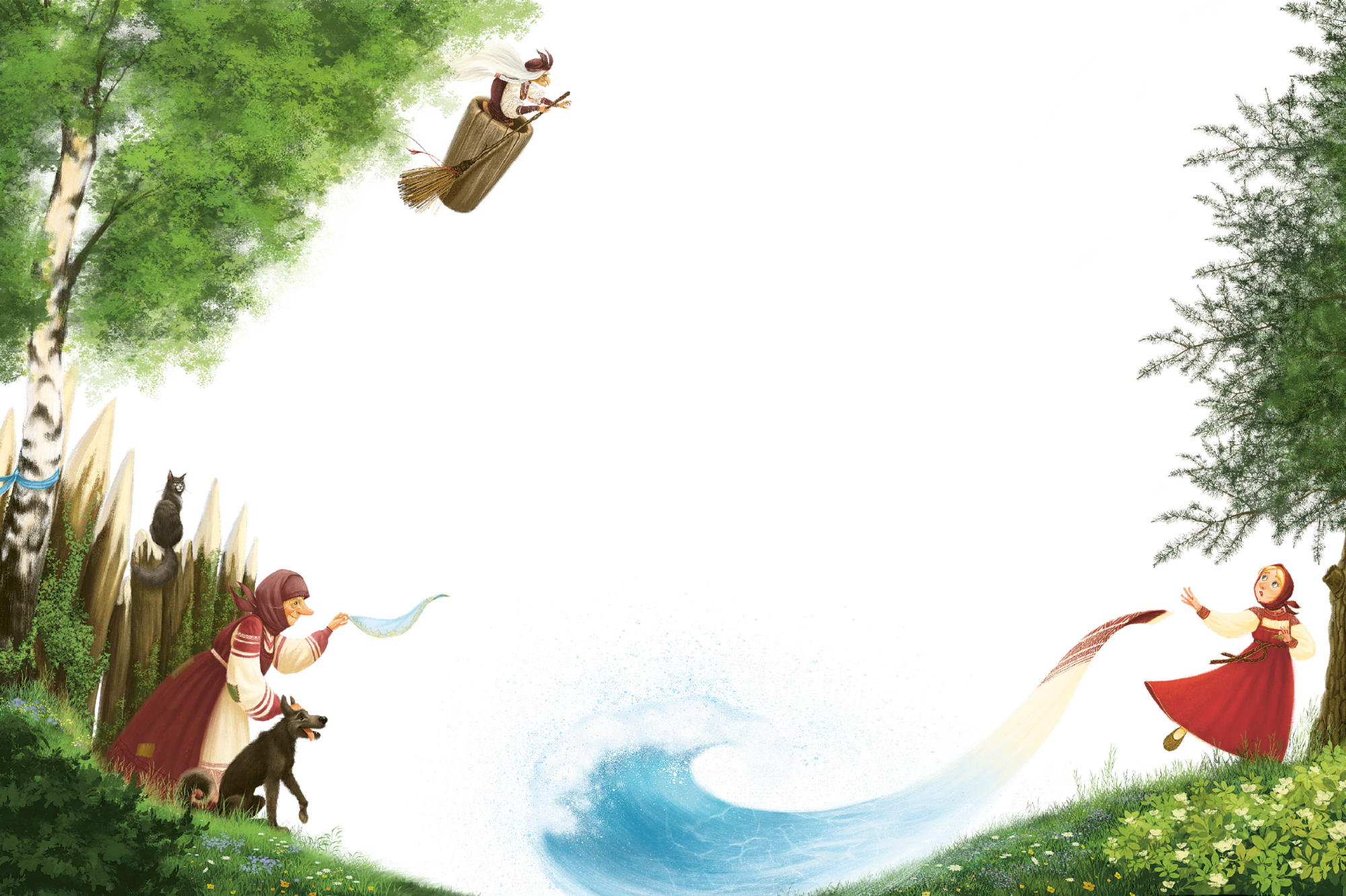 А девочка приложила ухо к земле и слышит, что Баба-яга за ней гонится и уже настигает её. Бросила поскорее девочка полотенце. Полотенце растянулось, и разлилась река широкая и глубокая.