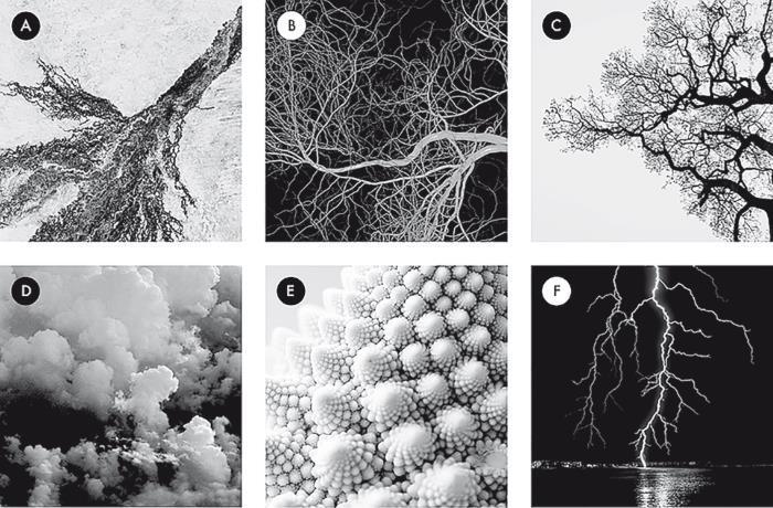 Примеры фрактальной геометрии в природе. В верхнем ряду: ветвящиеся реки (A), кровеносные сосуды (Б) и деревья (В) имеют схожие формы и самоподобны на разных масштабах; при увеличении или уменьшении масштаба изображения всегда похожи друг на друга. Другие фрактальные формы также демонстрируют это самоподобие на разных масштабах: пышные формы облаков (Г), конусообразные элементы спиралей капусты романеско (Д) и зазубренные ветви молний (Е).