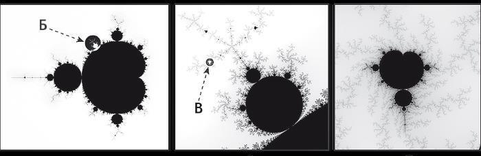 Эти детали классического фрактального множества Мандельброта демонстрируют самоподобие на разных масштабах. Если увеличить область Б на рисунке A, то мы увидим, что этот фрагмент (рис. Б) состоит из новых фракталов похожей формы. Аналогично, если увеличить область В на рисунке Б, то мы заметим, что этот фрагмент (рис. В) тоже состоит из новых фракталов. В чисто математическом царстве не существует предела этому вечно разворачивающемуся изображению фрактальных деталей до бесконечно малых масштабов.