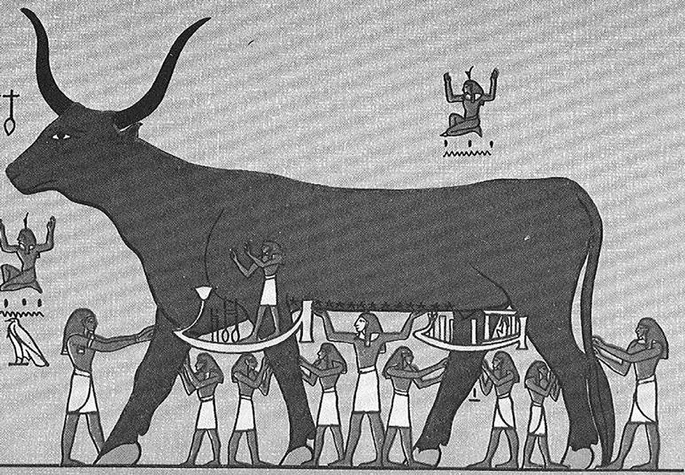 Иногда место Нут в мифах занимает олицетворение небесных вод – Мехет-Верет (Мехурт), иначе Небесная корова. Эта богиня изображается в обличье коровы с солнечным диском между рогами. Смена дня и ночи в данном случае объяснялась так: каждый день корова рождает солнце, а вечером глотает его, и за ночь оно проходит путь через ее тело, чтобы утром родиться вновь. Так Мехурт обеспечивает миропорядок. Нут тоже часто представляли в образе коровы (а еще смоковницы и даже свиньи) и верили, что она проглатывает Солнце, Луну и звезды, а потом рождает их снова. Руки и ноги богини – четыре стороны света.