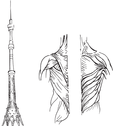 Позвоночник – это тоже башня, которая нуждается в поддержке. И если грудной отдел позвоночника укрепляется реберным каркасом, шея удерживает всего лишь голову, то вес всего тела, включая руки, передается на подвижный и поэтому уязвимый поясничный отдел позвоночника. Пирамида поясничных позвонков легко бы «разъехалась» в разные стороны, не будь у нее мощных стабилизаторов – а именно мышц спины, которые тянут позвоночник назад, и мышц брюшного пресса, тянущих позвоночник вперед. Равновесие этих сил, как на аптекарских весах, поддерживает позвоночник в устойчивом, вертикальном положении.