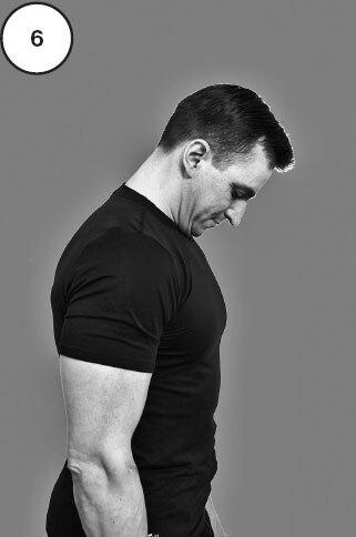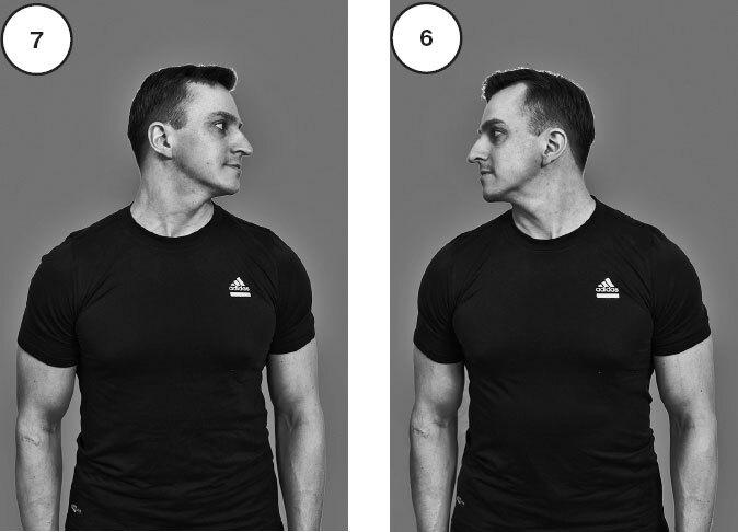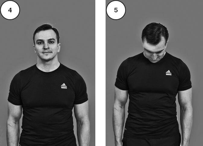 Стоя перед зеркалом, проверьте объем и свободу движений в шейном отделе позвоночника (рис. 4). Наклоните голову вперед так, чтобы достать подбородком до груди (рис. 5, 6). Если это затруднительно, то имеется ограничение сгибания шейного отдела позвоночника.