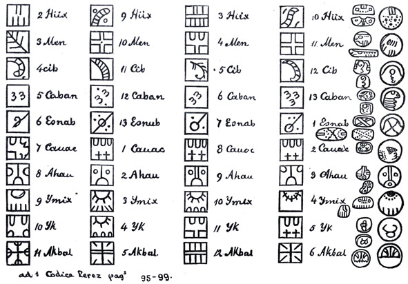The hieroglyphs of the days taken from the “Codex Troano,” an ancient Maya book written before the Conquest, probably about 1400, are also added to illustrate the variations which occurred in the hands of different scribes. Those from the “Books of Chilan Balam” are copied from a manuscript known to Maya scholars as the “Codice Perez,” of undoubted authenticity and antiquity.14-*