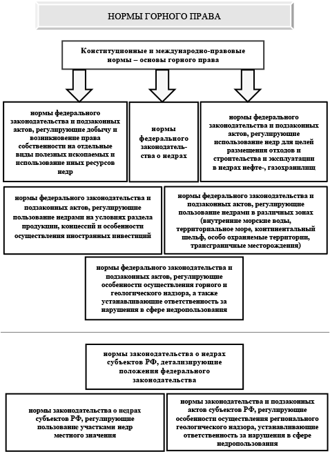 Кроме того, в указанной совокупности норм горного права можно определить признанную в российской правовой системе иерархию, выделив нормы законодательных актов и нормы подзаконных актов. В совокупности норм, относимых к горному праву, можно очертить структуру, выделив нормы горного права, принимаемые: