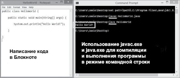 NetBeans — интегрированная среда разработки (IDE), которой мы будем пользоваться для упрощения процесса программирования. Строго говоря, приложения Java можно разрабатывать и без NetBeans. Вы можете писать код в Блокноте (или любом другом текстовом редакторе), а потом откомпилировать и выполнить его с помощью инструментов, предоставляемых JDK. На следующей иллюстрации показано, как это делается.