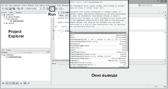 Программа просто выводит текст «Hello World» в окне вывода. Две другие строки содержат дополнительную информацию, которую предоставляет NetBeans, и не являются частью вывода.