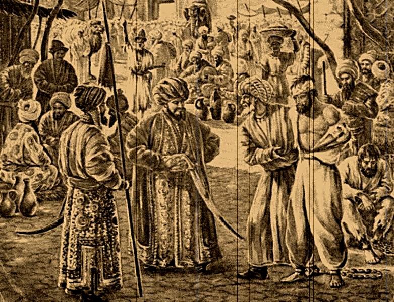 За воротами караван остановился: дорогу преградили стражники. Их было великое множество — обутых и босых, одетых и полуголых, еще не успевших разбогатеть на эмирской службе. Они толкались, кричали, спорили, заранее распределяя между собой наживу. Наконец из чайханы вышел сборщик пошлин — тучный и сонный, в шелковом халате с засаленными рукавами, в туфлях на босу ногу, со следами невоздержанности и порока на оплывшем лице. Окинув жадным взглядом купцов, он сказал: