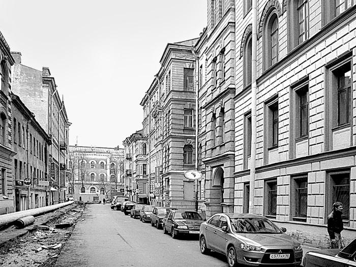 Полковая слобода уничтожалась в связи с переводом полка на новые квартиры в Миллионной улице, поближе к дворцу. Тогда-то и была проложена параллельная Литейному улица; о ней мы узнаём из объявления в тех же «Ведомостях» за 1800 год: «Между Литейной и Итальянской слободками, в новой улице, продается каменный дом… О цене можно узнать от г. коллежского советника Рыкова, живущего во втором каменном от Вспомогательного Банка доме». Поясню, что упомянутый в объявлении банк с 1798 года находился на месте нынешнего дома № 44 по Литейному проспекту, а дом Рыкова занимал смежный участок позади него, там, где позднее был выстроен дом № 8 по Эртелеву переулку, о котором у нас и пойдет речь.
