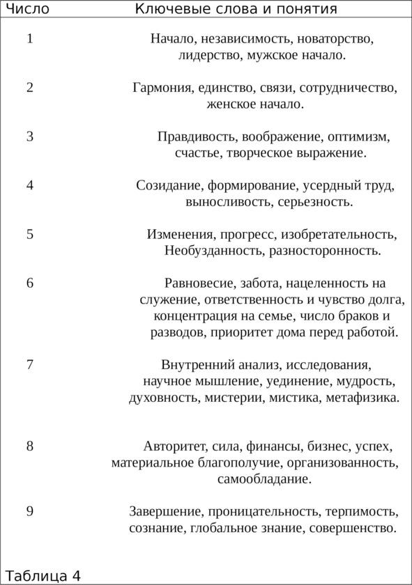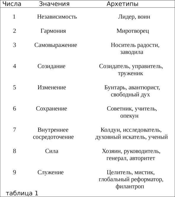 Поскольку числа от 1 до 9 — это основные числа нумерологической системы, значение каждого из которых можно рассмотреть в терминах архетипов (таблица 1).