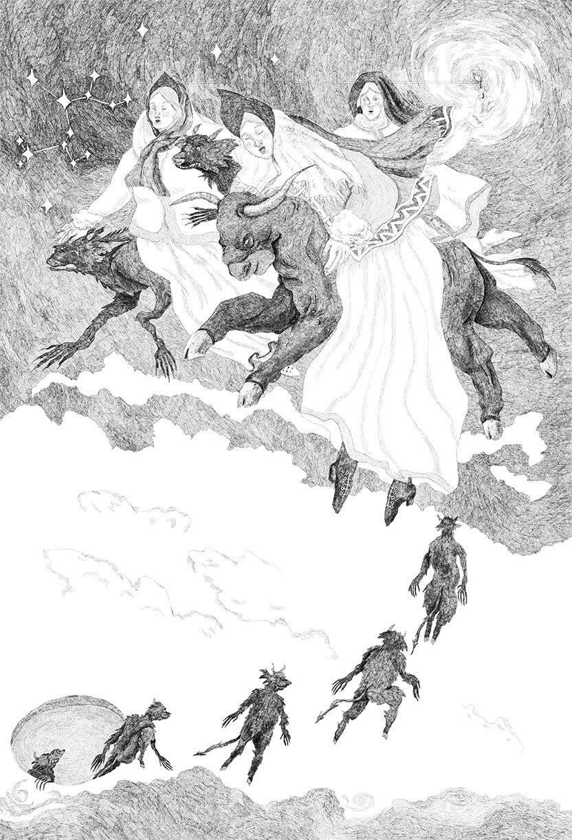 В некоторый вечер, то есть в святки, приехали к нему множество гостей; а по большей части из женского полу, и та, которой он давал больше всех преимущества и на которую взглядывал он непросто, следовательно, была она его любовницей. По пропетии подблюдных песен и по окончании других таких церемоний вздумалось хозяину на чертях покататься. А сие катание происходит таким образом. Берут девушки воловью кожу, таскают ее к пролуби и тамо, севши на нее, очерчиваются огарком, нарочно к тому изготовленным, а оной огарок великую имеет силу, понеже горит он в такой день, который называется у девушек особливым для открытия их участи. Из пролуби же выходят водяные демоны и возят их столько, сколько им угодно, и во время оное гадают девушки не о чем об ином, как только о своих женихах.