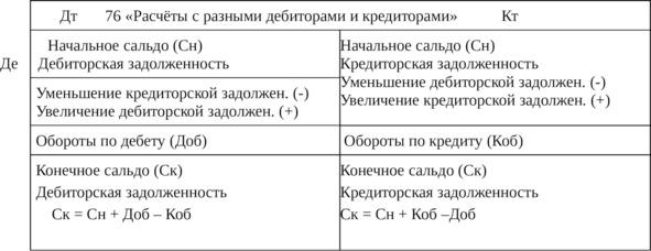 Понять эту схему просто: если сальдо (остаток) начальное по дебету, то и конечное тоже по дебету, значит, счёт в этот момент активный. Если начальное сальдо кредитовое, то конечное тоже кредитовое, значит, счёт пассивный. На практике: одно юридическое лицо должно вашему предприятию — это дебиторская задолженность (сальдо дебетовое), другому юридическому лицу вы должны — это кредиторская задолженность (сальдо кредитовое). Счёт ведётся по аналитике, то есть по юридическим лицам. Поэтому сальдо одновременно и по дебету, и по кредиту счета 76.