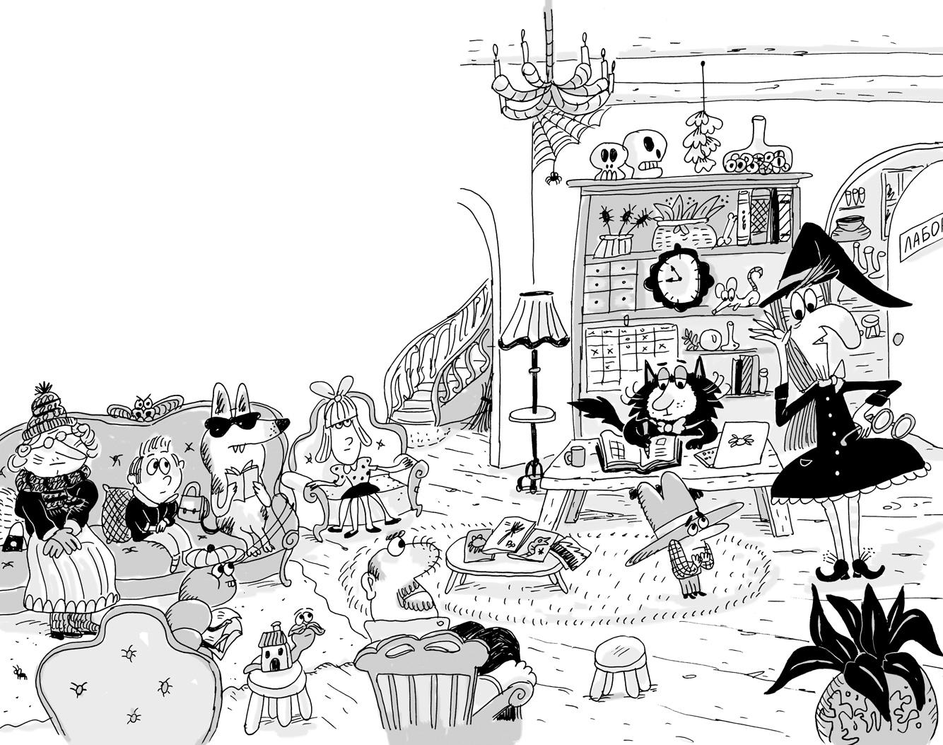 Гостиная Молли была превращена в комнату ожидания. Юная колдунья принимала пациентов у себя в лаборатории среди настоек, баночек, котелков, перегонных аппаратов и волшебных порошков. В углу было место Месье Филина, который, держа перо в клюве, вёл записи, выписывал рецепты и выдавал порошки и сиропы, изготовленные тремя скорпионами — ассистентами Молли.