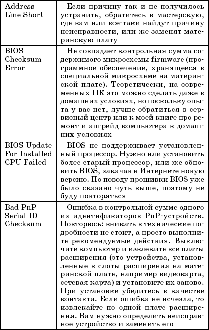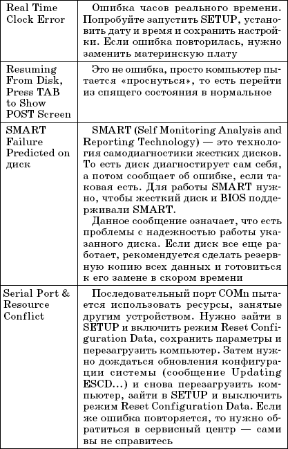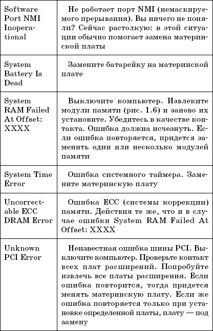 В табл. 1.1 указаны наиболее часто встречающиеся текстовые сообщения POST. Так как BIOS может быть от разных производителей, то сообщения об ошибках могут немного отличаться, но все равно по текстовому сообщению можно понять суть ошибки, а она будет одна и та же, вне зависимости от версии и производителя BIOS.