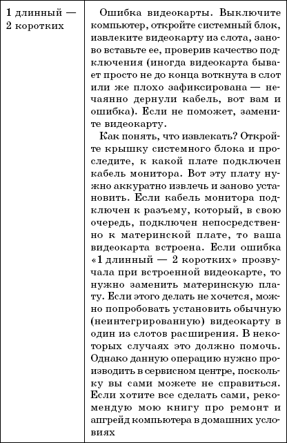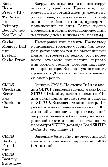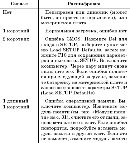 В особо тяжелых случаях, когда неисправность несовместима с работой ПК и он не может даже запуститься, подается звуковой сигнал. По этому сигналу также можно определить причину неисправности. О звуковых сигналах компьютера мы поговорим во второй главе этой книги.