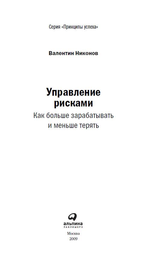 Управление рисками: Как больше зарабатывать и меньше терять / Валентин Никонов. — М.: Альпина Паблишер, 2009. — (Серия «Принципы успеха»).