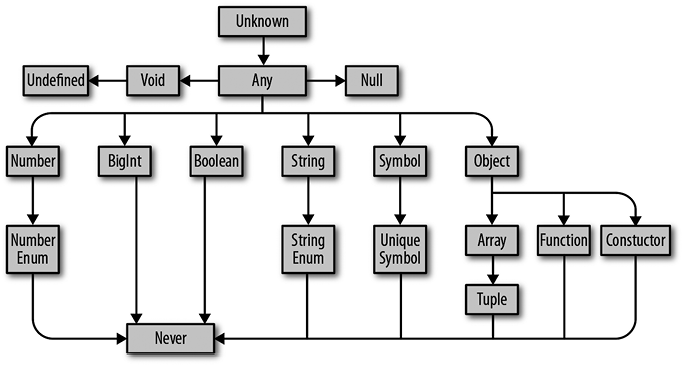 any выступает в роли крестного отца всех типов. За соответствующую плату он готов, но лишний раз прибегать к его помощи вы вряд ли захотите. В TypeScript в момент компиляции у всего должен быть тип, и any становится типом по умолчанию там, где вы (программист) и TypeScript (модуль проверки) не можете точно определить тип элемента. Можно охарактеризовать его как тип крайнего случая.