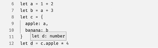 Наведите курсор на a, b, c, d и обратите внимание, как TypeScript выводит типы всех переменных: a является number, b и d также являются number, а c — это объект определенной формы (рис. 2.3).