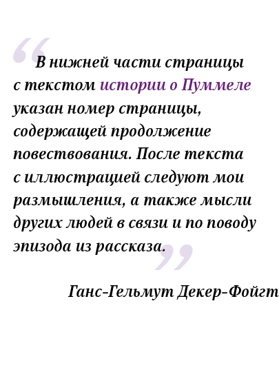Прежняя иллюстрированная книжка о Пуммеле была к тому времени распродана более десяти лет назад, и оттого я благодарен издательству «Nord-Süd-Verlag» за разрешение использовать оригинальную книгу о Пуммеле и возможность включения в неё моих текстов в качестве комментариев. А Пуммель, благодаря этой новой книге, где он является и действующим лицом, и объектом для комментариев, получил возможность вновь сойти, так сказать, со сцены и экрана и вернуться на книжные страницы к своему первоначальному виду.