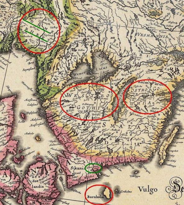 Случайно попался кусок бумажной карты Скандинавии заявленной древностью чуть ли не на «семнадцатый век» (ну что-ж, людям незнакомым с материаловедением такое по детски наивное отношение к срокам хранения скоропортящихся материалов простительно, но даже момент «нахождения» в середине Х1Х в. уже говорит о том что карта древняя и тем интереснее её содержимое), кружками я выделил очень броские названия, так вот оказывается и Римская Империя (Роммериикет), и Иудея (Ютландия), и остготы (Остроготия), и вестготы (Вестроготия), и готы (Готаланд), и бургунды (Борнхольм-Бургундархольм), и аланы (Оэландия), и Волга (Вульго), и Галлия-Голландия (Халандия), и Финляндия (Фюнландия), и Эллада (Эллумсюссель — Эллинская провинция), и Вендия-Вандалия (Вендсюссель), и Ругия (Рогаланд), и Киммерия-Кимбрия (Кимберсюссель), и многие другие известные наименования весьма компактно разбросаны на территориях… нынешних Дании, Швеции и Норвегии.
