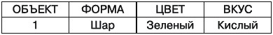 Каждый объект в базе данных обозначается ключом, или, как его еще называют, идентификатором, и характеризуется определенным значением по каждому из заранее установленных признаков. Например, если интересующий нас объект 1 представляет собой яблоко, то данное яблоко можно охарактеризовать как зеленый и кислый шар (рис. 3). Сам ключ ничего не означает, а лишь указывает на объект, характеризуют же зарегистрированный объект его признаки.