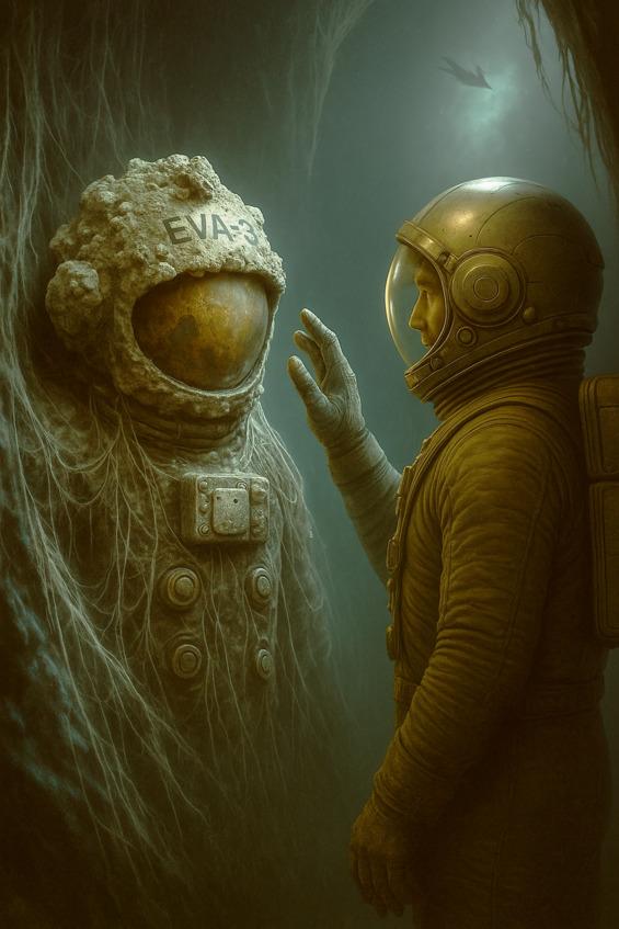 Наконец он увидел скафандр. Он был встроен прямо в стену, впаян, словно стал её частью. Сначала Мэлс принял его за изогнутую часть минерала, но приглядевшись, заметил очертания человеческой фигуры. Его сердце сжалось — не от страха, а от необъяснимой тоски. Шлем был повернут чуть вбок, как будто тот, кто был внутри, пытался что-то разглядеть перед тем, как замер навсегда. Вся поверхность скафандра была покрыта наростами, местами проросшими вглубь ткани, словно минерал питался изнутри.
