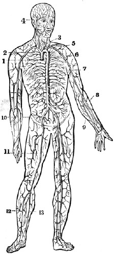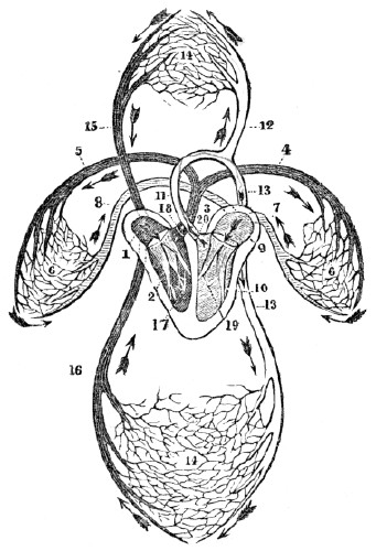 3, Branches of the pulmonary artery, that spread over the air-cells. Through the pulmonary artery the dark, impure blood is carried to the air-cells of the lungs. 4, Branches of the pulmonary vein, that commence at the minute terminations of the pulmonary artery. Through the pulmonary vein the red blood is returned to the heart.492. As the impure blood is passing in the minute vessels over the air-cells, the oxygen passes through the thin coats of the air-cells and blood-vessels, and unites with the blood. At the same time, the carbonic acid and water leave the blood, and pass through the coats of the blood-vessels and air-cells, and mix with the air in the cells. These are thrown out of the system every time we breathe. This interchange of products produces the change in the color of the blood.