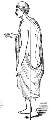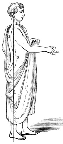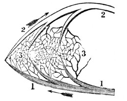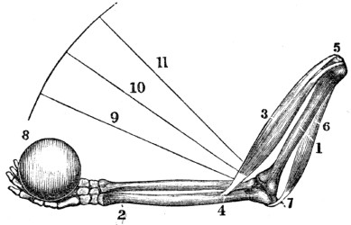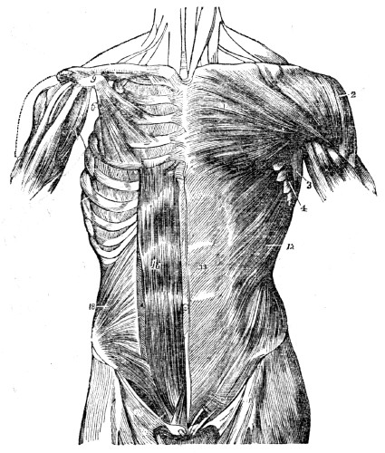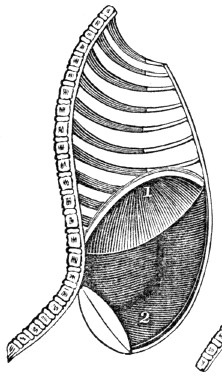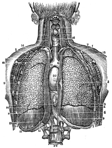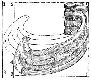 479. The tenth rib is raised eight times as much as the second rib, and the lateral diameter of the lower portion of the chest is increased in a corresponding degree. At the same time, the muscular margin of the diaphragm contracts, which depresses its central portion; and in this way, the chest is enlarged forward, laterally, and downward, simultaneously with the relaxation of the walls of the abdomen.
