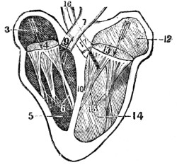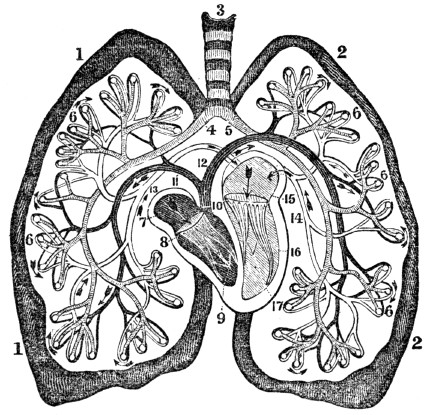 Fig. 99. An ideal view of the pulmonary circulation. 1, 1, The right lung. 2, 2, The left lung. 3, The trachea. 4, The right bronchial tube. 5, The left bronchial tube. 6, 6, 6, 6, Air-cells. 7, The right auricle. 8, The right ventricle. 9, The tricuspid valves. 10, The pulmonary artery. 11, The branch to the right lung. 12, The branch to the left lung. 13, The right pulmonary vein. 14, The left pulmonary vein. 15, The left auricle. 16, The left ventricle. 17, The mitral valves.