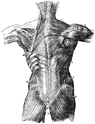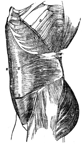 478. The central portion of the ribs is raised by the action of intercostal muscles. The first, or upper rib, has but little movement; the second has more motion than the first, while the third has still more than the second. The second rib is elevated by the contraction of the muscles between it and the first. The third rib is raised by the action of two sets of muscles; one lies between the first and second ribs, the other between the second and third. The motion of each succeeding rib is increased, because it is not only acted upon by the muscles that move the ribs above, but by an additional intercostal; so that the movement of the twelfth rib is very free, as it is elevated by the contraction of eleven muscles.