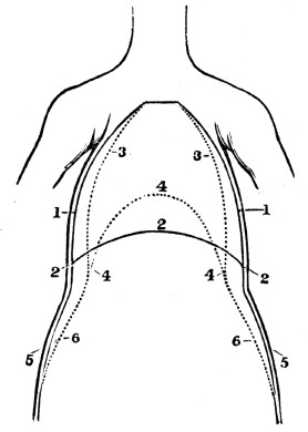 Fig. 96. A front view of the chest and abdomen in respiration. 1, 1, The position of the walls of the chest in inspiration. 2, 2, 2, The position of the diaphragm in inspiration. 3, 3, The position of the walls of the chest in expiration. 4, 4, 4, The position of the diaphragm in expiration. 5, 5, The position of the walls of the abdomen in inspiration. 6, 6, The position of the abdominal walls in