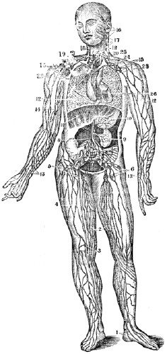 acid. The pressure of this invisible, elastic fluid upon the body of an ordinary sized adult, is estimated to equal thirty-five thousand pounds.487. The principal substance of a vitiated character in the dark-colored blood is carbonic acid. And since there is no chemical affinity between the oxygen and nitrogen of the air, the former readily unites with some of the elements of the blood. Hence, whenever blood is presented to the air in the lungs, the oxygen leaves the nitrogen, and becomes mixed with the circulating fluid. (Appendix J.)