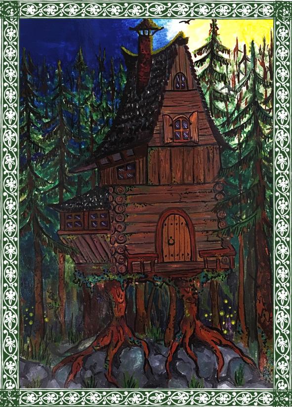 А сама вдруг остановилась, как вкопанная, перед самой дверью. И хотя ей было очень страшно, кое-что она все-таки заметила. В близи «куриные ноги», на которых стоял дом, оказались стволами больших деревьев. А то, что она из далека приняла за пальцы с когтями, были их корни.