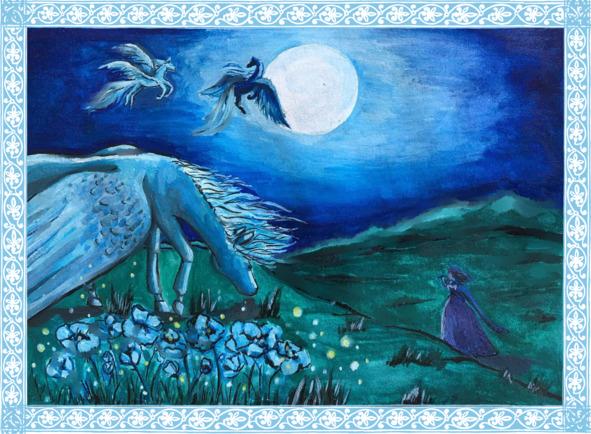 На фоне луны, плавно размахивая крыльями, летели… КОНИ! Они были, как и цветы, бело-голубого цвета. Огромные крылья несли их по небу, ветер развивал их гривы и хвосты. Они были ПРЕКРАСНЫ!