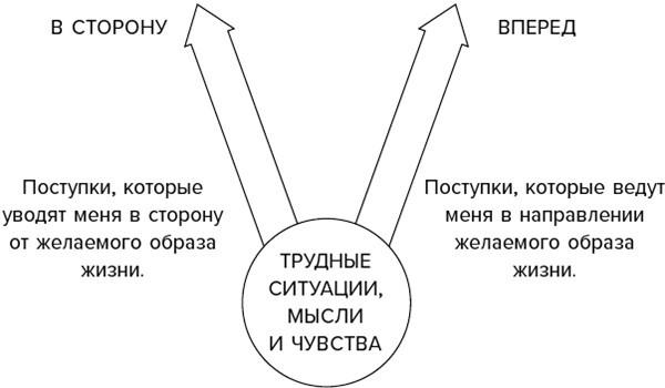 При возникновении таких трудных ситуаций, мыслей и чувств мы можем реагировать на них либо шагами вперед, либо шагами в сторону, как это показано на рисунке ниже.
