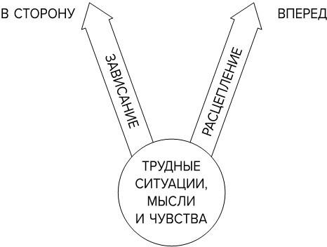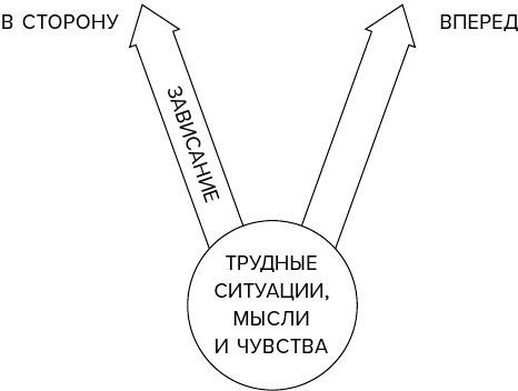 Приведенная выше схема официально называется «точка выбора», поскольку каждый раз, когда жизнь осложняется и появляются трудные мысли и чувства, возможен выбор. Можно отреагировать на происходящее действенными мерами, направленными на повышение качества жизни (шагами вперед), или же бесполезными, укорачивающими жизнь поступками (шагами в сторону). Но обратите внимание на слово «возможен». Выбор возможен только в случае, когда мы успешно овладели навыками расцепления. В их отсутствие выбора у нас нет и срабатывает «настройка по умолчанию» – мы зависаем и делаем множество шагов в сторону, часто даже не сознавая этого вплоть до самого последнего момента. В общем, чем ниже уровень способности к расцеплению, тем меньше вероятность наличия выбора; а между тем мысли и чувства стремятся завладеть нами, вершить наши жизни и диктовать, что можно, а что нет.