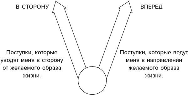 В одних случаях мы делаем то, что помогает продвинуться к желаемому образу жизни. Назовем такие поступки «шагами вперед». В других случаях мы совершаем нечто, что уводит нас в сторону от желаемого образа жизни. Назовем такие поступки «шагами вбок». Это показано на рисунке: