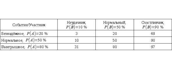 Таблица 1. Успех исхода события P (A/B) в % в зависимости от успешности участника.
