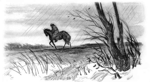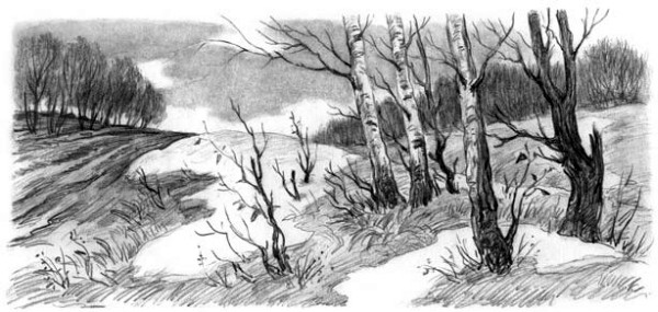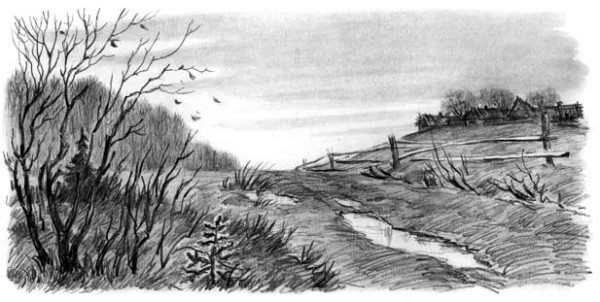 Вот уж и деревья стоят все голые, только на рябине висят ее красные гроздья,дожидаясь мороза. Пусто, глухо и в полях и в лесах. Земля, почернелая, грязная, пропитанная дождем, смотрит уныло под свинцовым небом: хоть бы снег поскорее закрыл ее неприятную наготу. Появляется и снег; но долго еще он не может удержаться и, оставшись иногда на несколько часов, снова исчезает.