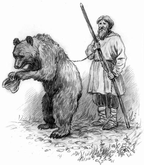 – А ну-ка, Миша, – говорит нижегородец, дергая медведя цепью, – встань, подымись, с боку на бок перевались, честным господам поклонись и молодкам покажись.