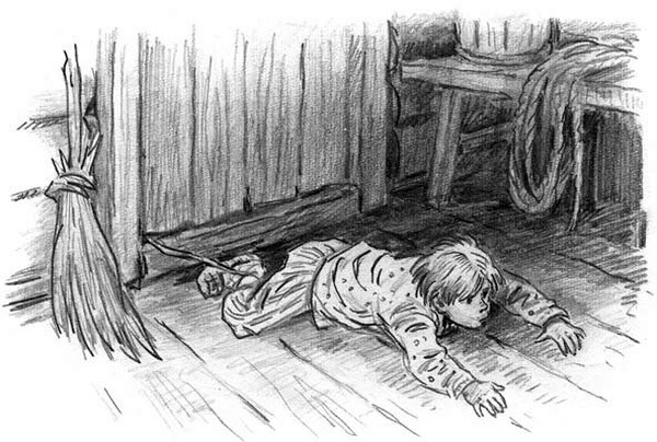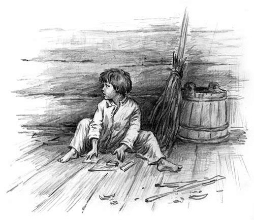 Не понравилось это сыну и невестке: перестали они отца с собой за стол сажать, запрятали его за печь и стали кормить из глиняной чашки. Задрожали руки у старика, чашка упала и разбилась. Пуще прежнего разозлились сын и невестка: стали они кормить отца из старой деревянной миски.
