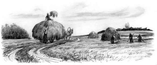 Много, много летом работы крестьянину! Вот он вспахал озимые поля[11] и приготовил к осени мягкую колыбельку хлебному зерну. Еще не успел он кончить пахоты, как уже настает пора косить. Косари, в белых рубахах, с блестящими и звенящими косами в руках, выходят на луга и дружно подкашивают под корень высокую, уже осеменившуюсятраву. Острые косы блестят на солнце и звенят под ударами набитой песком лопатки. Женщины также дружно работают граблями и сваливают уже подсохшее сено в копны. Приятный звон кос и дружные, звонкие песни несутся повсюду с лугов. Вот уже строятся и высокие круглые стога. Мальчики валяются в сене и, толкая друг друга, заливаются звонким смехом; а мохнатая лошаденка, вся засыпанная сеном, едва волочит на веревке тяжелую копну.
