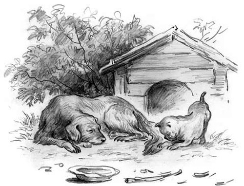 К Полкану подбежал маленький Мопс и стал на него кидаться и лаять; хватал его зубами за огромные лапы, за морду и, казалось, очень надоедал большой и угрюмой собаке.