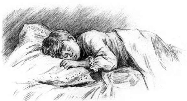 Детям стало еще скучнее, и они подумали, что им лучше было бы пойти сначала в школу, а потом уж, идучи из школы, зайти в рощу. Но в это самое время мальчик приметил на зеленой ветке крошечную, красивую малиновку. Она сидела, казалось, очень спокойно и от нечего делать насвистывала превеселую песенку.