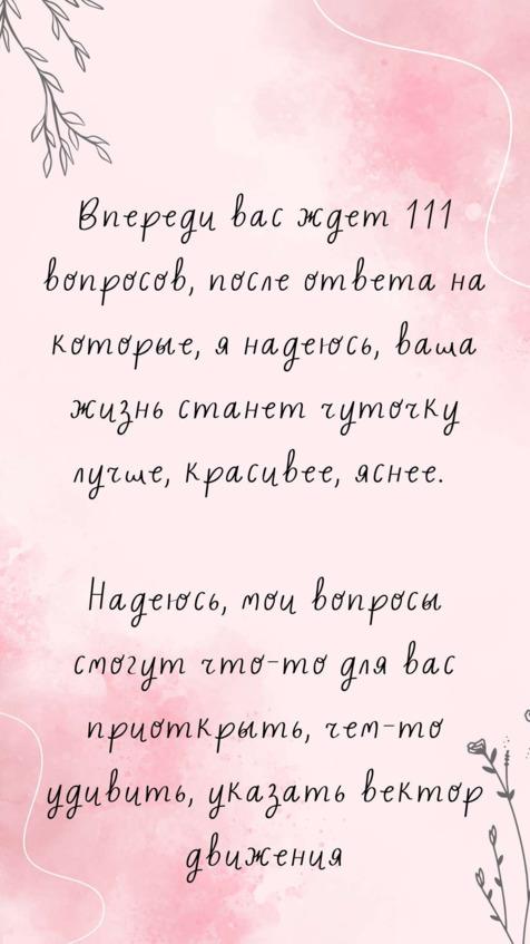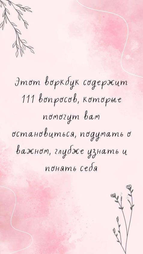 Этот воркбук содержит 111 вопросов, которые помогут вам остановиться, подумать о важном, глубже узнать и понять себя, свои ценности, желания.
