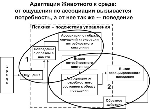 Система памяти животных построена на ассоциациях последовательностей воспринимаемых событий внешних и собственных ощущений S (enses) и восприятий целых комплексов ощущений S (ense perception), включая и сами потребностные состояния — возбуждения N (eed) или их снятия not N (eed). Кроме того, психика Животных (на подсознании, то есть автоматически) записывает важные поведения A (ction) как поведения, снимающие потребность или вызывающие полезные для Жизни потребности. Так записываются состояния приближающейся опасности, или подвернувшиеся ситуации пользы (для Жизни).